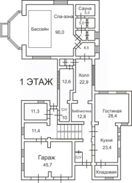 1 этаж: просторная кухня-столовая, гостиная, библиотека, холл со вторым светом, два санузла. Просторная СПА зона с большим бассейном, сауной, душевыми, и зоной отдыха с выходом во двор.