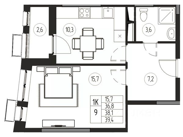 Общая площадь квартиры - 38,1 кв. м, просторная кухня 10,3 м с выходом на лоджию 2,6 м, комната 15,7 м.