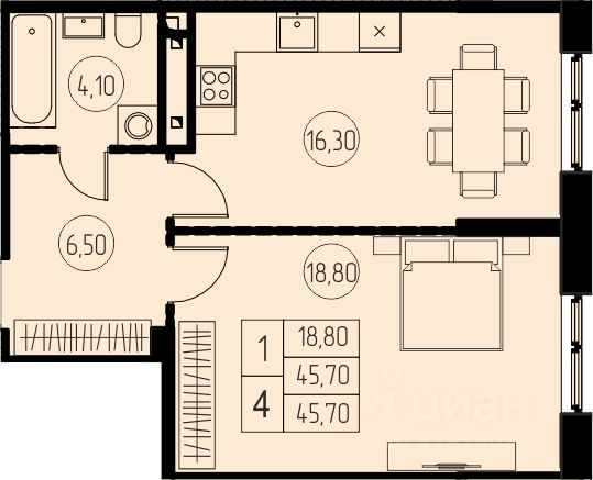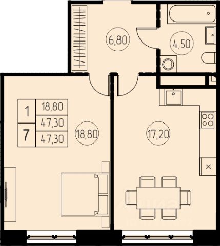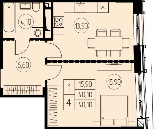 Общая площадь квартиры - 36,5 кв. м, просторная кухня 8,6 м с выходом на лоджию 3.2 м, комната 14.2 м.