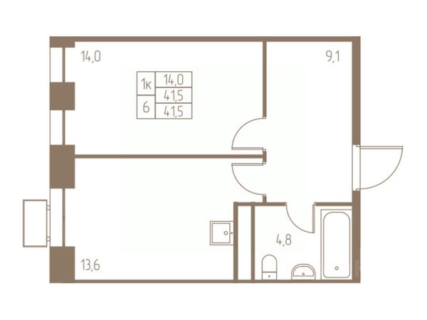 Общая площадь 44 м2, комната 16м2, кухня 9м2.