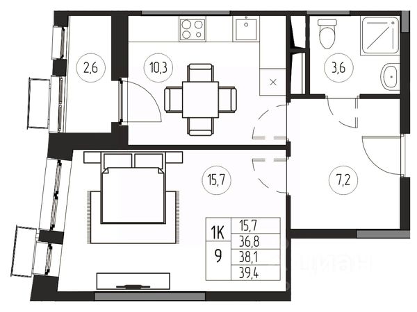 Общая площадь 44 м2, комната 16м2, кухня 9м2.