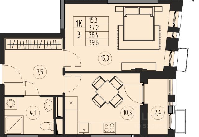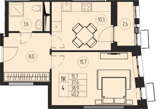 Общая площадь квартиры - 38,1 кв. м, просторная кухня 10,3 м с выходом на лоджию 2,6 м, комната 15,7 м.