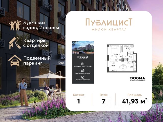 В продаже 1-комнатная квартира площадью 41.89 кв. м на 4 этаже. Квартира расположена в современном жилом комплексе "Публицист" от DOGMA, в корпусе 10. Акция! В честь дня рождения компании DOGMA приобретайте квартиру в ЖК "Публицист" со скидкой до 14%! Успейте оформить покупку жилья на выгодных условиях до 31 марта! "Публицист" - это уникальный жилой квартал, который сочетает в себе современный комфорт и культурное наследие. Впечатляющая история локации и невероятные лесные пейзажи стали вдохновением для создания проекта комфорт-класса, где предусмотрено всё, чтобы больше времени уделять тому, что воодушевляет и радует. На территории квартала появятся пешеходные бульвары с местами для тихого отдыха, спортивные и игровые площадки из экологичных материалов, собственный лес для прогулок и семейных пикников. Украшением территории станут яркие инсталляции и живописное озеленение. Жилой комплекс "Публицист" - это комфортная и безопасная среда для всех. В дизайнерских лобби предусмотрены колясочные, места для хранения велосипедов, камерные лаунж-зоны и современные лифты. В зелёных дворах не будет машин. Для автомобилистов будет возведено 7 многоуровневых паркингов на 4 041 машино-место, 14 подземных паркингов для 3 780 автомобилей, гостевые парковки на 2 194 места. В составе проекта построят пять детских садов на 1500 мест, две школы для 3 300 учеников, физкультурно-оздоровительный комплекс и поликлинику, рассчитанную на 432 посещения в смену. Первые этажи домов займут коммерческие помещения. В шаговой доступности от квартала находятся торговые центры с кинотеатрами, строительные гипермаркеты, дворец спорта с бассейном. До пляжа реки Серебрянки - 17 минут пешком. На машине за 7 минут можно доехать до дендропарка ВНИИЛМ, за 30 минут - до Национального парка "Лосиный остров". Согласно рейтингу отраслевого СМИ "Все о стройке" в феврале 2026 года DOGMA занимает 3-е место в РФ по объему текущего строительства жилья, а также является крупнейшим застройщиком Краснодарского края.
