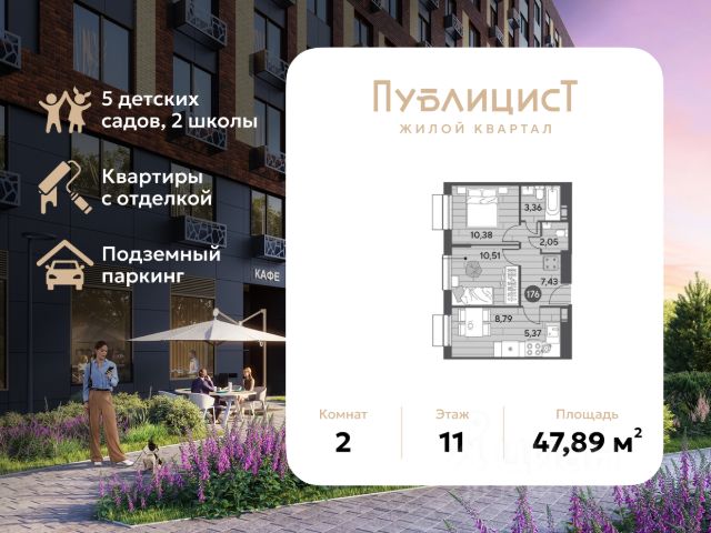 В продаже 2-комнатная квартира площадью 47.89 кв. м на 11 этаже. Квартира расположена в современном жилом комплексе "Публицист" от DOGMA, в корпусе 10. "Публицист" - это уникальный жилой квартал, который сочетает в себе современный комфорт и культурное наследие. Впечатляющая история локации и невероятные лесные пейзажи стали вдохновением для создания проекта комфорт-класса, где предусмотрено всё, чтобы больше времени уделять тому, что воодушевляет и радует. На территории квартала появятся пешеходные бульвары с местами для тихого отдыха, спортивные и игровые площадки из экологичных материалов, собственный лес для прогулок и семейных пикников. Украшением территории станут яркие инсталляции и живописное озеленение. Жилой комплекс "Публицист" - это комфортная и безопасная среда для всех. В дизайнерских лобби предусмотрены колясочные, места для хранения велосипедов, камерные лаунж-зоны и современные лифты. В зелёных дворах не будет машин. Для автомобилистов будет возведено 7 многоуровневых паркингов на 4 041 машино-место, 14 подземных паркингов для 3 780 автомобилей, гостевые парковки на 2 194 места. В составе проекта построят пять детских садов на 1500 мест, две школы для 3 300 учеников, физкультурно-оздоровительный комплекс и поликлинику, рассчитанную на 432 посещения в смену. Первые этажи домов займут коммерческие помещения. В шаговой доступности от квартала находятся торговые центры с кинотеатрами, строительные гипермаркеты, дворец спорта с бассейном. До пляжа реки Серебрянки - 17 минут пешком. На машине за 7 минут можно доехать до дендропарка ВНИИЛМ, за 30 минут - до Национального парка "Лосиный остров". Согласно рейтингу отраслевого СМИ "Все о стройке" в феврале 2026 года DOGMA занимает 3-е место в РФ по объему текущего строительства жилья, а также является крупнейшим застройщиком Краснодарского края.