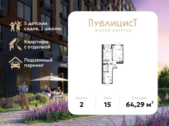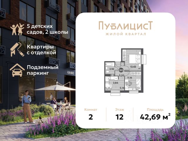 В продаже 2-комнатная квартира площадью 42.69 кв. м на 12 этаже. Квартира расположена в современном жилом комплексе "Публицист" от DOGMA, в корпусе 10. "Публицист" - это уникальный жилой квартал, который сочетает в себе современный комфорт и культурное наследие. Впечатляющая история локации и невероятные лесные пейзажи стали вдохновением для создания проекта комфорт-класса, где предусмотрено всё, чтобы больше времени уделять тому, что воодушевляет и радует. На территории квартала появятся пешеходные бульвары с местами для тихого отдыха, спортивные и игровые площадки из экологичных материалов, собственный лес для прогулок и семейных пикников. Украшением территории станут яркие инсталляции и живописное озеленение. Жилой комплекс "Публицист" - это комфортная и безопасная среда для всех. В дизайнерских лобби предусмотрены колясочные, места для хранения велосипедов, камерные лаунж-зоны и современные лифты. В зелёных дворах не будет машин. Для автомобилистов будет возведено 7 многоуровневых паркингов на 4 041 машино-место, 14 подземных паркингов для 3 780 автомобилей, гостевые парковки на 2 194 места. В составе проекта построят пять детских садов на 1500 мест, две школы для 3 300 учеников, физкультурно-оздоровительный комплекс и поликлинику, рассчитанную на 432 посещения в смену. Первые этажи домов займут коммерческие помещения. В шаговой доступности от квартала находятся торговые центры с кинотеатрами, строительные гипермаркеты, дворец спорта с бассейном. До пляжа реки Серебрянки - 17 минут пешком. На машине за 7 минут можно доехать до дендропарка ВНИИЛМ, за 30 минут - до Национального парка "Лосиный остров". Согласно рейтингу отраслевого СМИ "Все о стройке" в феврале 2026 года DOGMA занимает 3-е место в РФ по объему текущего строительства жилья, а также является крупнейшим застройщиком Краснодарского края.