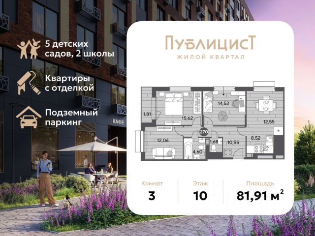 В продаже 3-комнатная квартира площадью 81.91 кв. м на 7 этаже. Квартира расположена в современном жилом комплексе "Публицист" от DOGMA, в корпусе 12. Акция! В честь дня рождения компании DOGMA приобретайте квартиру в ЖК "Публицист" со скидкой до 14%! Успейте оформить покупку жилья на выгодных условиях до 31 марта! "Публицист" - это уникальный жилой квартал, который сочетает в себе современный комфорт и культурное наследие. Впечатляющая история локации и невероятные лесные пейзажи стали вдохновением для создания проекта комфорт-класса, где предусмотрено всё, чтобы больше времени уделять тому, что воодушевляет и радует. На территории квартала появятся пешеходные бульвары с местами для тихого отдыха, спортивные и игровые площадки из экологичных материалов, собственный лес для прогулок и семейных пикников. Украшением территории станут яркие инсталляции и живописное озеленение. Жилой комплекс "Публицист" - это комфортная и безопасная среда для всех. В дизайнерских лобби предусмотрены колясочные, места для хранения велосипедов, камерные лаунж-зоны и современные лифты. В зелёных дворах не будет машин. Для автомобилистов будет возведено 7 многоуровневых паркингов на 4 041 машино-место, 14 подземных паркингов для 3 780 автомобилей, гостевые парковки на 2 194 места. В составе проекта построят пять детских садов на 1500 мест, две школы для 3 300 учеников, физкультурно-оздоровительный комплекс и поликлинику, рассчитанную на 432 посещения в смену. Первые этажи домов займут коммерческие помещения. В шаговой доступности от квартала находятся торговые центры с кинотеатрами, строительные гипермаркеты, дворец спорта с бассейном. До пляжа реки Серебрянки - 17 минут пешком. На машине за 7 минут можно доехать до дендропарка ВНИИЛМ, за 30 минут - до Национального парка "Лосиный остров". Согласно рейтингу отраслевого СМИ "Все о стройке" в феврале 2026 года DOGMA занимает 3-е место в РФ по объему текущего строительства жилья, а также является крупнейшим застройщиком Краснодарского края.
