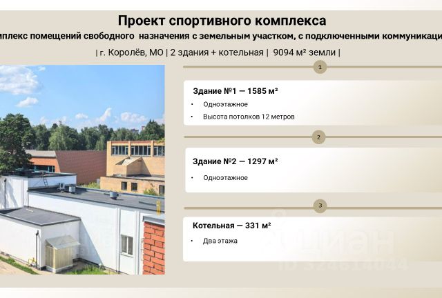 Комплекс, состоящий из трех отдельно стоящих зданий, расположенные земельном участке площадью 9094 м2 МО г. Королев ул. Пролетарская