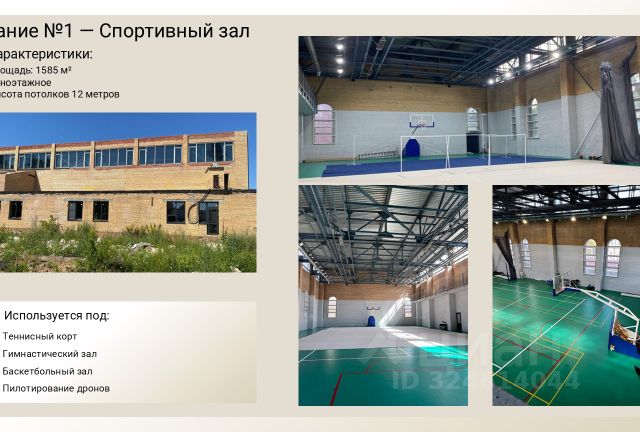 Здание - площадь 1585,2 м2, 1 этаж и 1 подземный этаж , здание действующее - спортивный зал с раздевалкой, санузлом