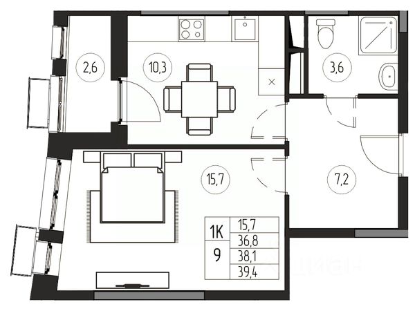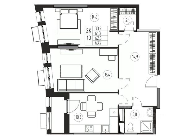 Общая площадь составляет 43,3 кв.м. Пространственная структура включает отдельную комнату, кухню, прихожую, коридор и совместный санузел. Есть большой вместительный балкон, где можно устроить зону отдыха или хранения вещей. Квартира обладает приятным освещением и атмосферой домашнего тепла.