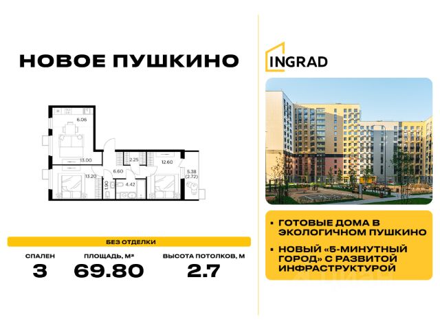 Прямая продажа от девелопера. В жилом квартале комфорт-класса "Новое Пушкино" (девелопер Ingrad) продаётся 3-спальная квартира площадью 69.80 кв.м без отделки. Квартира расположена на 12 этаже 15-этажного дома, корпус 21. Расположение и окружение: Жилой квартал "Новое Пушкино" расположен в экологичном городе Пушкино. Рядом с кварталами расположены: Северный лесопарк - 650 м, пушкинский ЦПКиО - 1 км, дендрарий - 1 км, ферма-экопарк "Птичник" - 1,2 км, парк "Серебрянка" вдоль одноимённой реки - 3,5 км. В окрестностях есть большие водоёмы и лесные массивы, где можно загорать, плавать и наслаждаться пикником на берегу. Отличная транспортная доступность: До Ярославского шоссе, по которому можно добраться до МКАД, всего 3 км. Важным пунктом развития инфраструктуры станет строительство Мытищинской хорды (Северного дублёра МКАД). Железнодорожные станции Заветы Ильича и Пушкино расположены в 1,5 км и 3 км.. Инфраструктура: "Новое Пушкино" - новый "5-минутный город" с собственной развитой инфраструктурой, где всё необходимое находится в пределах пяти минут пешей прогулки. Район уже полностью сложился: социальные и сервисные объекты функционируют, обеспечивая жителям высокий уровень комфорта и удобства. В нём уже построено 29 домов, работают два детских сада и школа. Свой прогулочный бульвар протяжённостью более 500 м располагает пространствами для отдыха, занятий спортом и встреч с друзьями. Здесь есть велосипедные дорожки, воркаут-зоны, теннисные столы и детские площадки. На первых этажах домов открыты кафе, магазины и сервисы, которые упрощают повседневные дела. Запланировано строительство торгового центра. Стоимость квартиры - 17 410 000 Р. Срок сдачи - 3 квартал 2025. Более подробную информацию по объекту уточняйте по телефону и в отделе продаж.