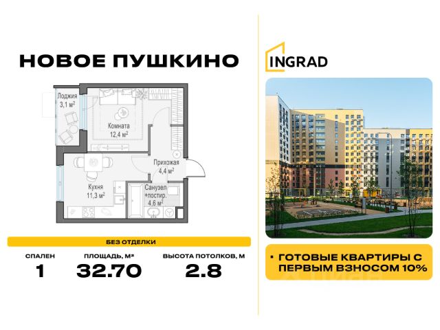 Прямая продажа от девелопера. В жилом квартале комфорт-класса "Новое Пушкино" (девелопер Ingrad) продаётся 1-спальная квартира площадью 32.00 кв.м без отделки. Квартира расположена на 14 этаже 15-этажного дома, корпус 20. Расположение и окружение: Жилой квартал "Новое Пушкино" расположен в экологичном городе Пушкино. Рядом с кварталами расположены: Северный лесопарк - 650 м, пушкинский ЦПКиО - 1 км, дендрарий - 1 км, ферма-экопарк "Птичник" - 1,2 км, парк "Серебрянка" вдоль одноимённой реки - 3,5 км. В окрестностях есть большие водоёмы и лесные массивы, где можно загорать, плавать и наслаждаться пикником на берегу. Отличная транспортная доступность: До Ярославского шоссе, по которому можно добраться до МКАД, всего 3 км. Важным пунктом развития инфраструктуры станет строительство Мытищинской хорды (Северного дублёра МКАД). Железнодорожные станции Заветы Ильича и Пушкино расположены в 1,5 км и 3 км.. Инфраструктура: "Новое Пушкино" - новый "5-минутный город" с собственной развитой инфраструктурой, где всё необходимое находится в пределах пяти минут пешей прогулки. Район уже полностью сложился: социальные и сервисные объекты функционируют, обеспечивая жителям высокий уровень комфорта и удобства. В нём уже построено 29 домов, работают два детских сада и школа. Свой прогулочный бульвар протяжённостью более 500 м располагает пространствами для отдыха, занятий спортом и встреч с друзьями. Здесь есть велосипедные дорожки, воркаут-зоны, теннисные столы и детские площадки. На первых этажах домов открыты кафе, магазины и сервисы, которые упрощают повседневные дела. Запланировано строительство торгового центра.