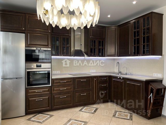 Просторная гостиная, объединённая с кухней, украшенная большими окнами, выходящими сразу на две стороны света, создавая ощущение простора и наполненности светом, встроенный кухонный гарнитур выполнен из массива дерева;
