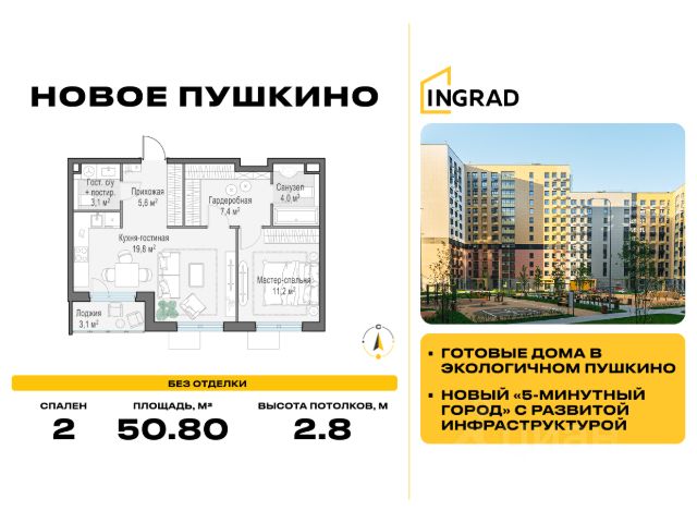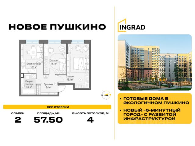 Прямая продажа от девелопера. В жилом квартале комфорт-класса "Новое Пушкино" (девелопер Ingrad) продаётся 2-спальная квартира площадью 57.50 кв.м без отделки. Квартира расположена на 1 этаже 15-этажного дома, корпус 20. Расположение и окружение: Жилой квартал "Новое Пушкино" расположен в экологичном городе Пушкино. Рядом с кварталами расположены: Северный лесопарк - 650 м, пушкинский ЦПКиО - 1 км, дендрарий - 1 км, ферма-экопарк "Птичник" - 1,2 км, парк "Серебрянка" вдоль одноимённой реки - 3,5 км. В окрестностях есть большие водоёмы и лесные массивы, где можно загорать, плавать и наслаждаться пикником на берегу. Отличная транспортная доступность: До Ярославского шоссе, по которому можно добраться до МКАД, всего 3 км. Важным пунктом развития инфраструктуры станет строительство Мытищинской хорды (Северного дублёра МКАД). Железнодорожные станции Заветы Ильича и Пушкино расположены в 1,5 км и 3 км.. Инфраструктура: "Новое Пушкино" - новый "5-минутный город" с собственной развитой инфраструктурой, где всё необходимое находится в пределах пяти минут пешей прогулки. Район уже полностью сложился: социальные и сервисные объекты функционируют, обеспечивая жителям высокий уровень комфорта и удобства. В нём уже построено 29 домов, работают два детских сада и школа. Свой прогулочный бульвар протяжённостью более 500 м располагает пространствами для отдыха, занятий спортом и встреч с друзьями. Здесь есть велосипедные дорожки, воркаут-зоны, теннисные столы и детские площадки. На первых этажах домов открыты кафе, магазины и сервисы, которые упрощают повседневные дела. Запланировано строительство торгового центра. Стоимость квартиры - 9 190 000 Р. Срок сдачи - 3 квартал 2025. Более подробную информацию по объекту уточняйте по телефону и в отделе продаж.