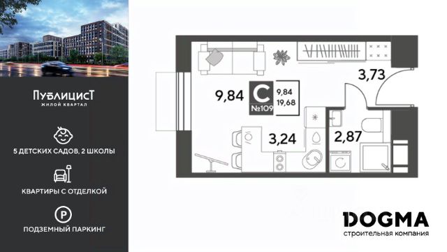 В продаже квартира-студия от DOGMA! Корпус 7. Срок сдачи: 2 кв. 2028, общей площадью 17.63 кв.м., на 5 этаже. На территории квартала появятся пешеходные бульвары с местами для отдыха, детские и спортивные площадки, свой собственный лес для прогулок. Будет построено пять детских садов на 1 500 мест, две школы для 3 300 учеников, физкультурно-оздоровительный комплекс и поликлиника, рассчитанная на 432 посещения в смену. В зелёных дворах не будет машин. Для автомобилистов будет возведено семь многоуровневых паркингов на 4 041 машино-место, 14 подземных паркингов для 3 780 автомобилей, гостевые парковки на 2 194 места. Первые этажи домов займут коммерческие помещения. В шаговой доступности от квартала находятся торговые центры с кинотеатрами, строительные гипермаркеты. Дворец спорта с бассейном. До пляжа реки Серебрянки — 17 минут пешком. На машине за семь минут можно доехать до дендропарка ВНИИЛМ, за 30 минут — до Национального парка "Лосиный остров".