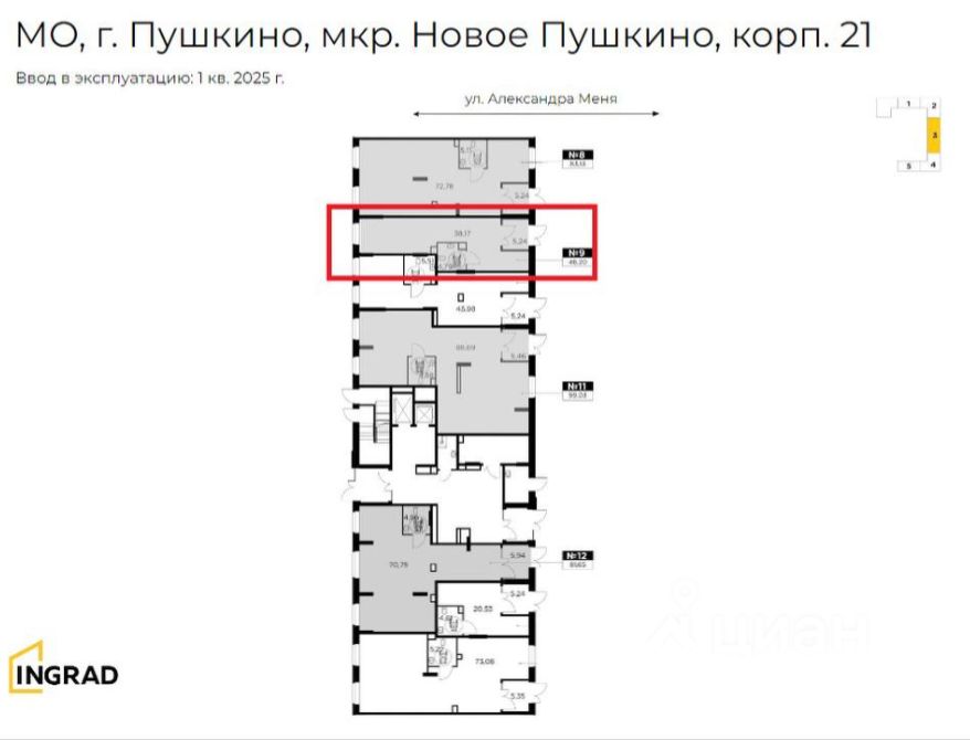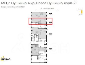 Торговая площадь 49 м² в ЖК "Новое Пушкино". Помещение находится в доме, где расположен "Супермаркет" на 600 м² и так же въезд в ЖК со Старо-Ярославского шоссе. ЖК рассчитан на 16 000 жителей. Электрическая мощность 20квт