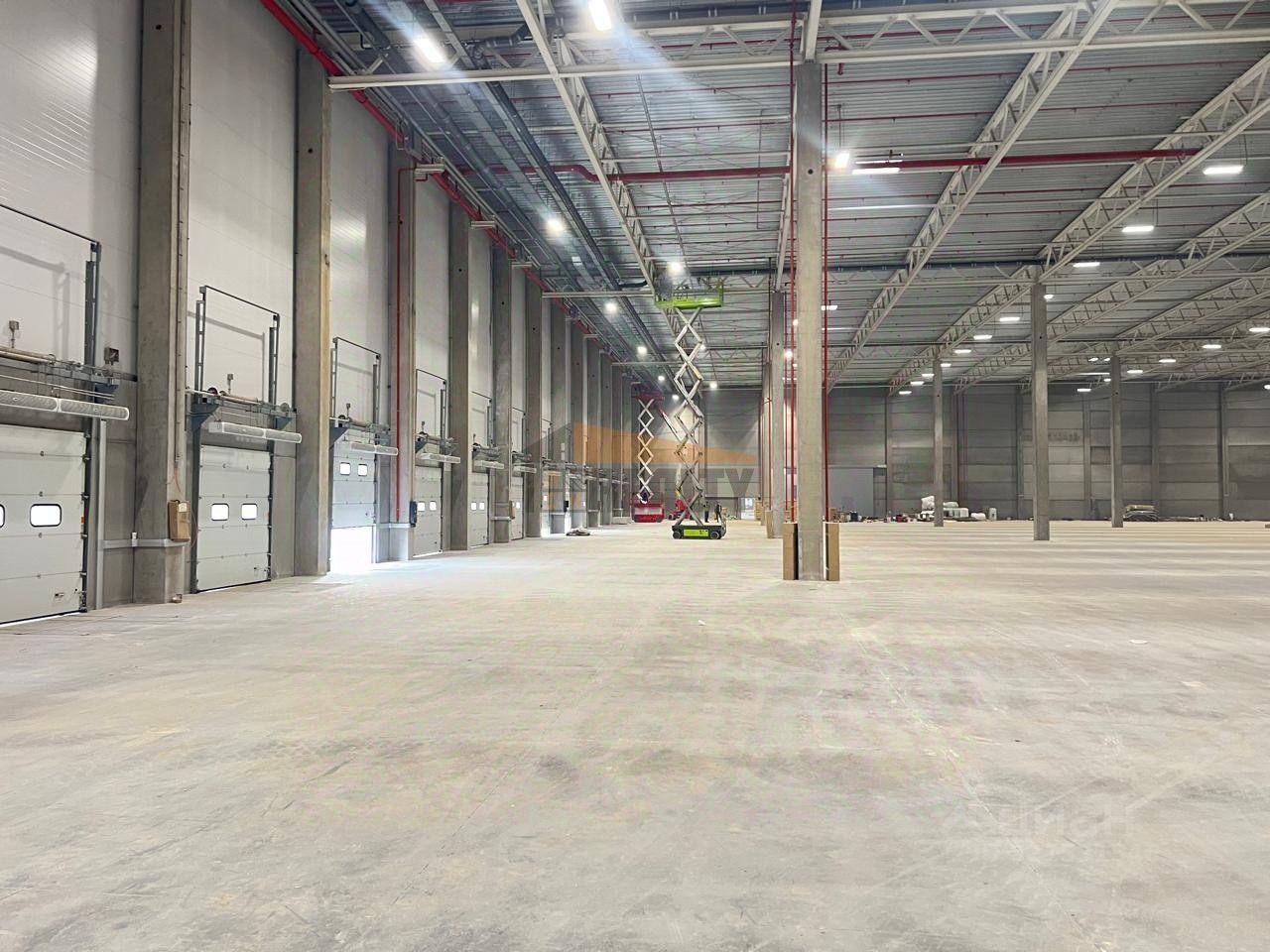 Бетонный пол с антипылевым покрытием. Допустимая нагрузка на пол 9 т/м2. Рабочая высота потолков 12м. Доковые ворота 10 шт. с в выравнивающими площадками и уплотнительными контурами. Спринклерная система пожаротушения и пожарная сигнализация. Встроенные офисно-бытовые помещения в обоих крыльях здания.