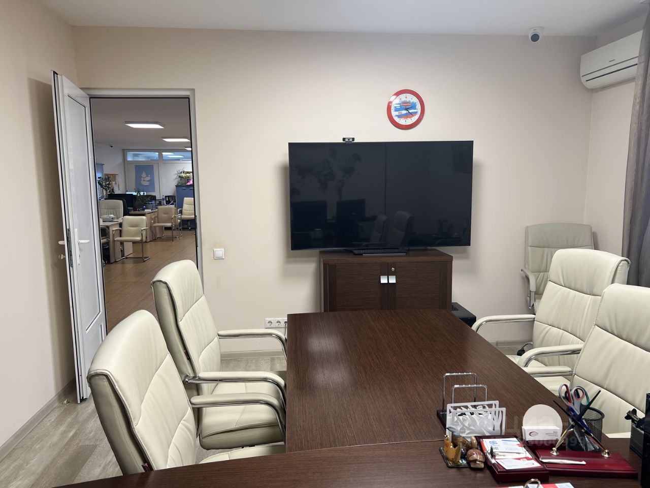 Есть две просторные пере говорки, два кабинета, кухня . Так же на каждом этаже по санузлу. Кондиционеры в каждом помещение.