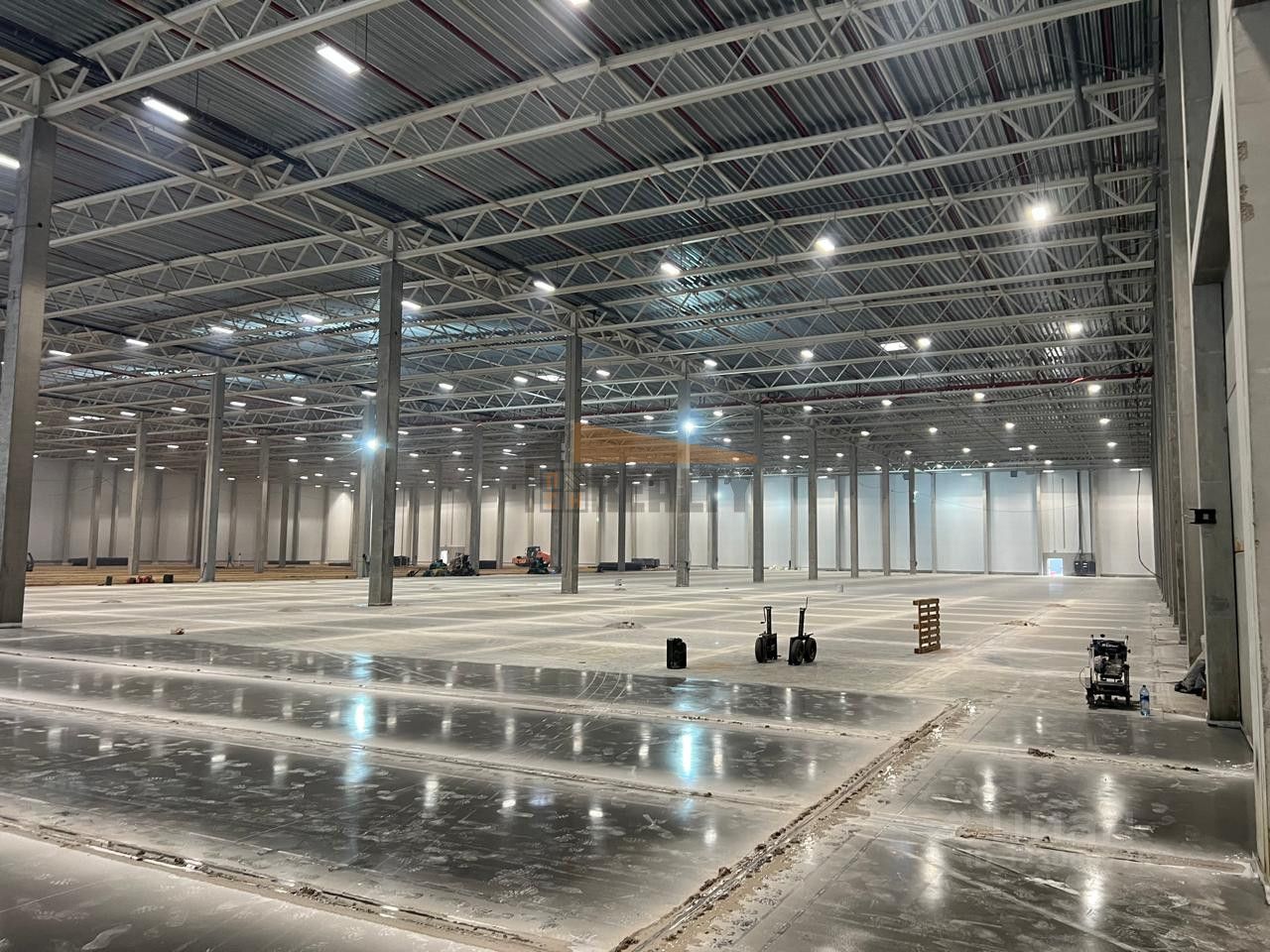 Бетонный пол с антипылевым покрытием. Допустимая нагрузка на пол 9 т/м2. Рабочая высота потолков 12м. Одни доковые ворота на каждую 1000 м2 с в выравнивающими площадками и уплотнительными контурами. Спринклерная система пожаротушения и пожарная сигнализация. Встроенные офисно-бытовые помещения в обоих крыльях здания.