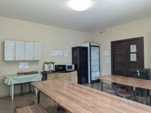 Просторная кухня: несколько электрических плит, несколько холодильников