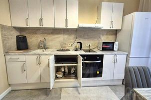 В просторной кухне есть микроволновка, плита, чайник, вместительный холодильник, набор посуды, бокалы для вина, мини бар. Гостям бесплатно предоставляется вода, чай, сахар, сливки