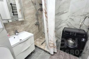 В ванной стиральная машина, душевая, полотенца, тапочки, туалетные принадлежности, фен