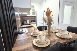 В кухне в наличии микроволновка, плита, чайник, вместительный холодильник, набор посуды, бокалы для вина, мини бар. Гостям бесплатно предоставляется вода, чай, сахар, сливки
