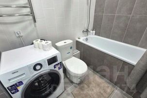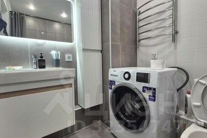 В ванной стиральная машина, душ, полотенца, тапочки, туалетные принадлежности, фен