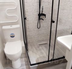 В ванной комнате просторный душевой угол 100х100 см с тропическим душем.
