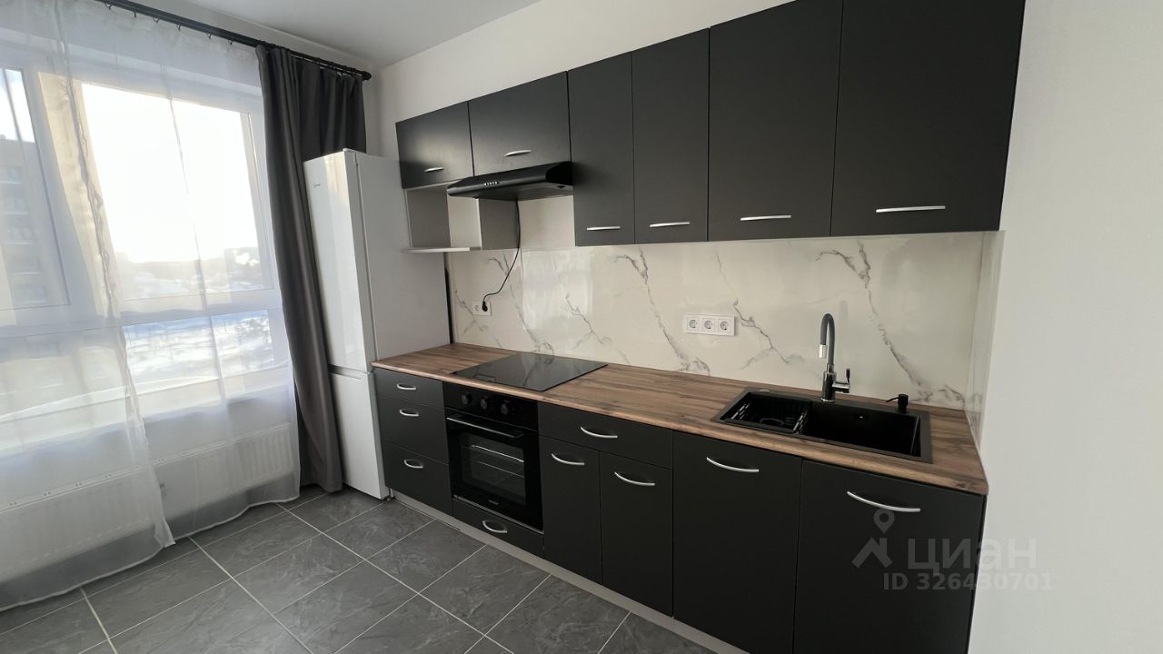 Просторная кухня оборудована всей необходимой техникой (холодильник, стиральная машина, варочная панель, духовой шкаф, вытяжка, микроволновая печь).