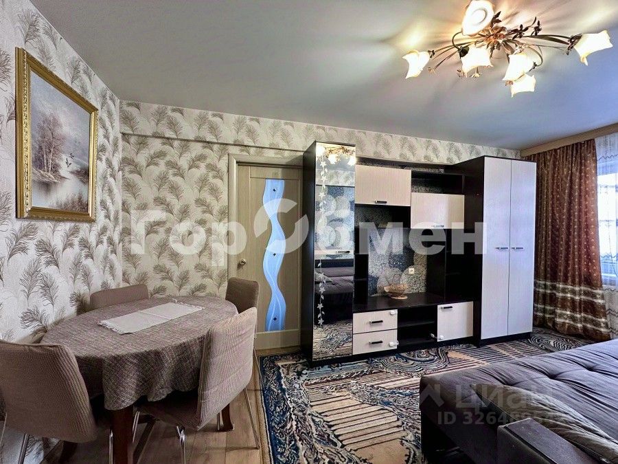 Есть остекленный балкон. В большой комнате расположен вместительный гардероб , большой диван, обеденный стол.
