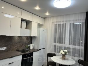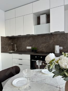 Квартира укомплектована новыми техникой и мебелью: духовой шкаф, холодильник, стол со стульями, стиральная машина (в процессе установки), телевизор, кровать с подьемным механизмом,