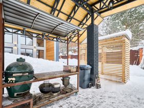 На участке вы сможете воспользоваться крытой площадкой с мангальной зоной, барбекю и казаном.