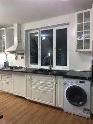 Кухня оборудована необходимой посудой и техникой: микроволновка, посудомойка, стиральная машина.