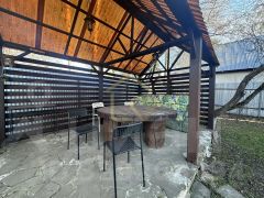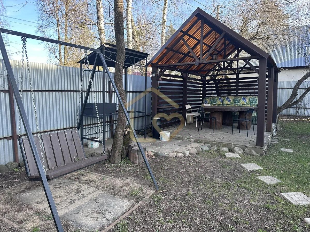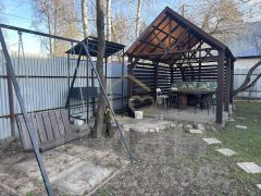 На участке газон, беседка с мангальной зоной, парковочное место, качели.