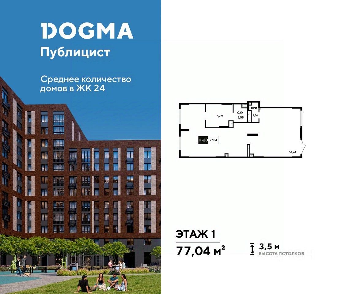 В продаже от DOGMA! Корпус . Срок сдачи: 4 кв. 2026, общей площадью77.04 кв.м., на 1 этаже. На территории квартала появятся пешеходныебульвары с местами для отдыха, детские и спортивные площадки, свой собственный лес для прогулок. Будет построено пять детских садов на 1500 мест, две школы для 3 300 учеников, физкультурно-оздоровительный комплекс и поликлиника, рассчитанная на 432 посещения в смену. В зелёных дворах не будет машин. Для автомобилистовбудет возведено семь многоуровневых паркингов на 4 041 машино-место, 14 подземных паркингов для 3 780 автомобилей, гостевые парковки на 2 194 места. Первые этажи домов займут коммерческиепомещения. В шаговой доступности от квартала находятся торговые центры с кинотеатрами, строительные гипермаркеты. Дворец спорта с бассейном. До пляжа реки Серебрянки — 17 минут пешком. На машине за семь минут можно доехать до дендропарка ВНИИЛМ, за 30 минут — до Национального парка "Лосиный остров".
