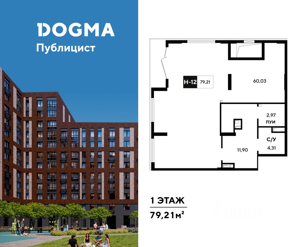 В реализации — коммерческое помещение свободного назначения в литере 11 общей площадью 79.21 кв.м. на 1 этаже от застройщика DOGMA в жилом квартале "Публицист", который расположен в г. Пушкино (Московская область).