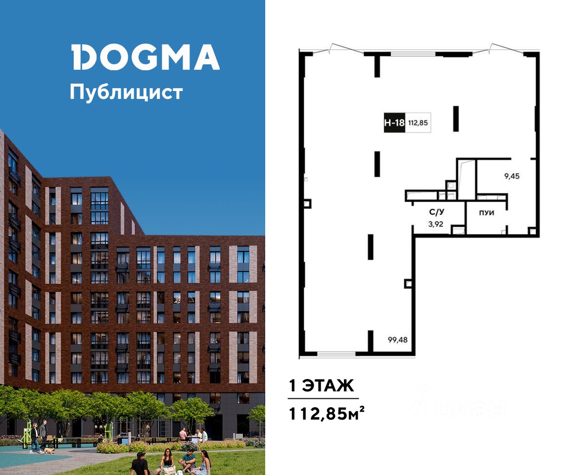 В реализации — коммерческое помещение свободного назначения в литере 11 общей площадью 112.85 кв.м. на 1 этаже от застройщика DOGMA в жилом квартале "Публицист", который расположен в г. Пушкино (Московская область).