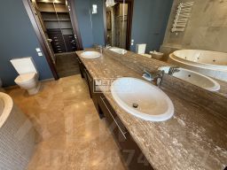 Роскошная ванная комната: огромная ванна-джакузи, две раковины, тропический душ, полноценное окно, выход на лоджию, зеркало во всю стену. Настоящая зона релакса!