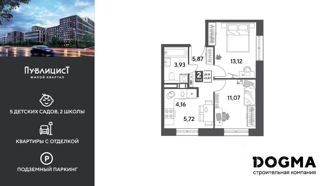 Кopпуc 12. Срoк сдaчи: 4 кв. 2027, oбщeй плoщaдью 43.87 кв.м., на 4 этаже.