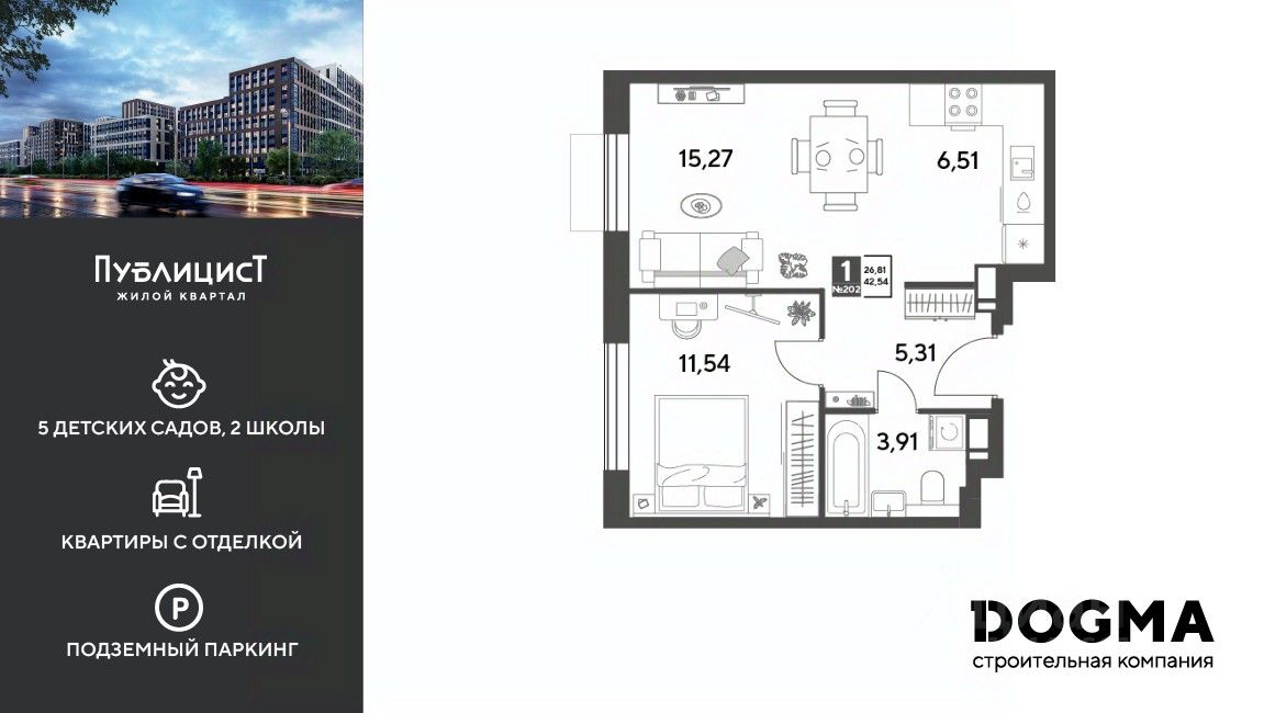 Кopпуc 12. Срoк сдaчи: 4 кв. 2027, oбщeй плoщaдью 42.54 кв.м., на 10 этаже.