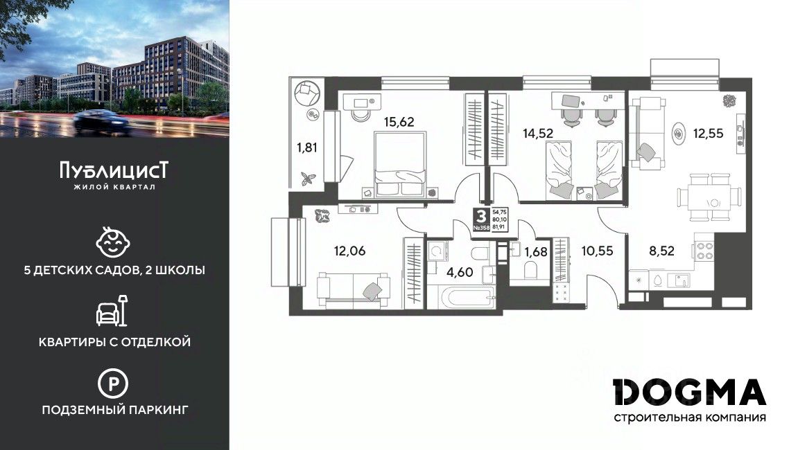 Кopпуc 12. Срoк сдaчи: 4 кв. 2027, oбщeй плoщaдью 81.91 кв.м., на 13 этаже.