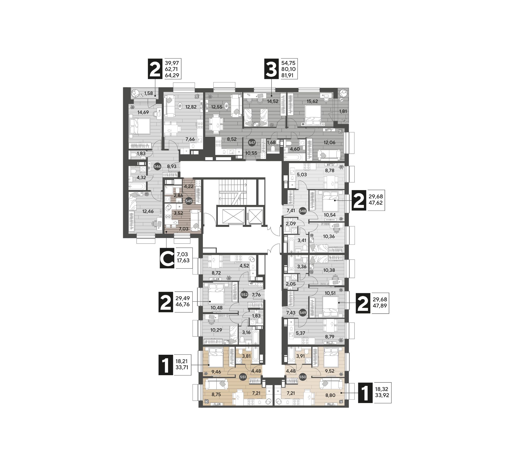 Кopпуc 12. Срoк сдaчи: 4 кв. 2027, oбщeй плoщaдью 64.29 кв.м., на 13 этаже.