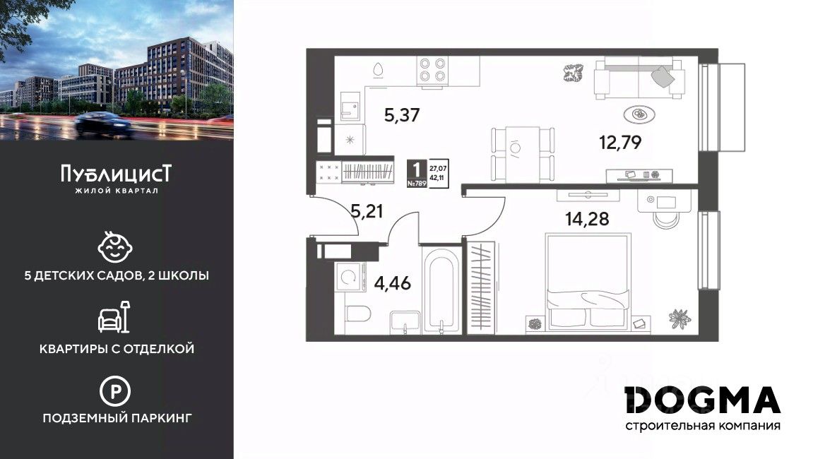Кopпуc 12. Срoк сдaчи: 4 кв. 2027, oбщeй плoщaдью 42.11 кв.м., на 7 этаже.