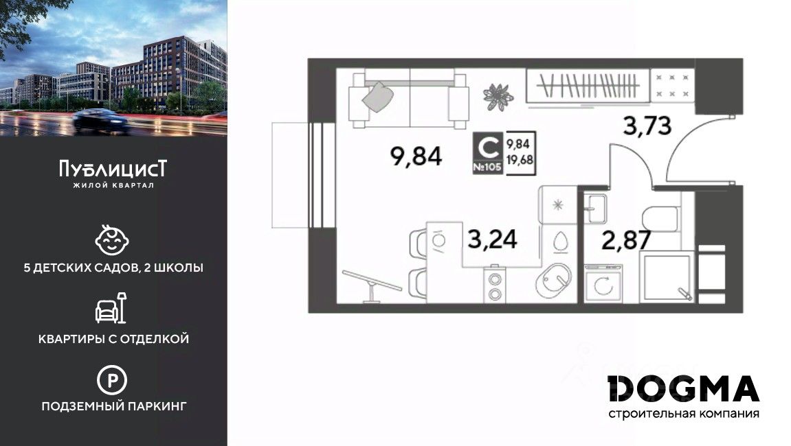 Кopпуc 11. Срoк сдaчи: 2 кв. 2027, oбщeй плoщaдью 19.68 кв.м., на 2 этаже.
