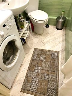 Встроенная угловая кухня остается новым владельцам. Сан/узел полностью выложен красивой кафельной плиткой.