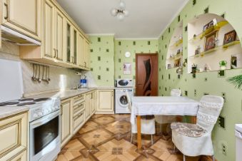 - Уютная кухня 12 кв.м. оснащена дорогим кухонным гарнитуром и техникой. Из кухни выход на застекленную лоджию.