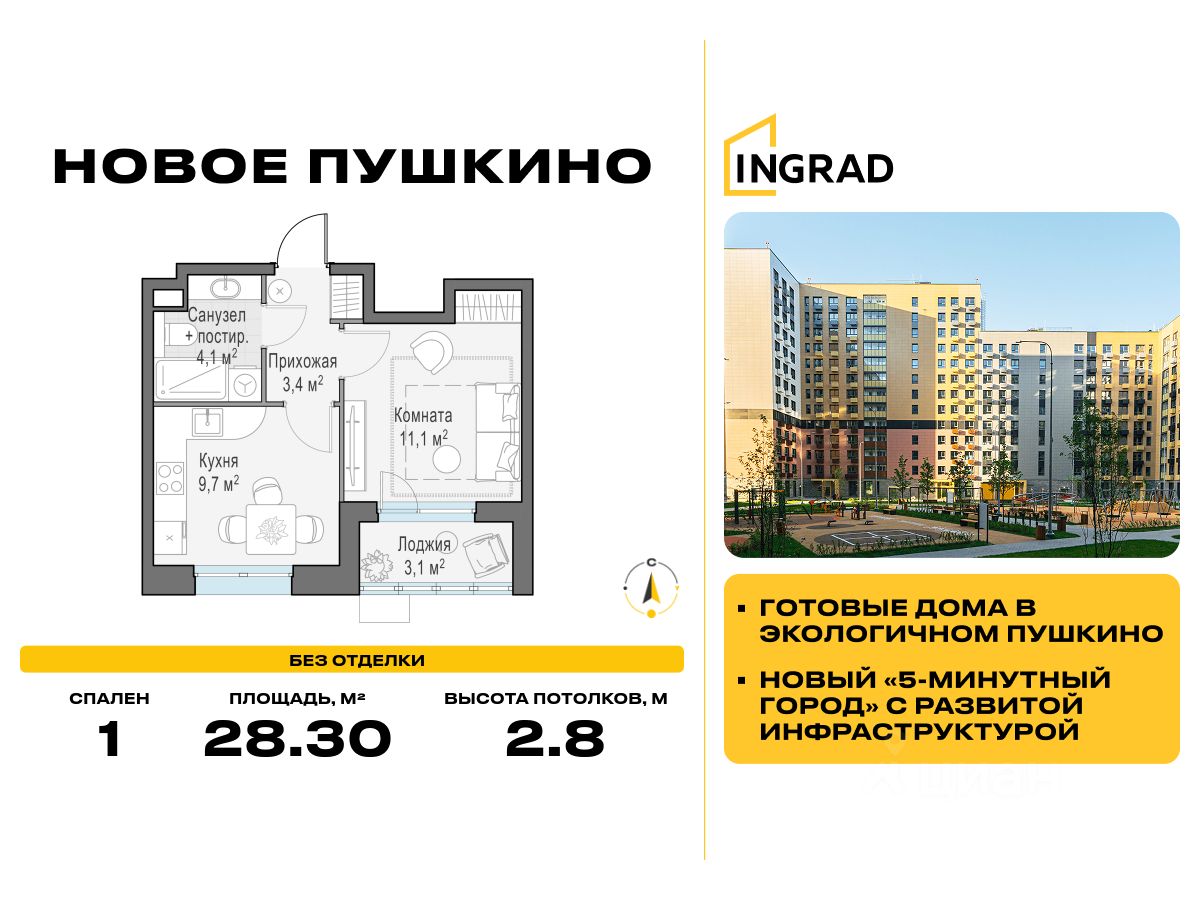 Прямая продажа от деволопера. В жилом квартале комфорт-класса "Новое Пушкино" (девелопер Ingrad) продаётся 1-спальная квартира площадью 28.30 кв.м без отделки. Квартира расположена на 13 этаже 15-этажного дома, корпус 21.