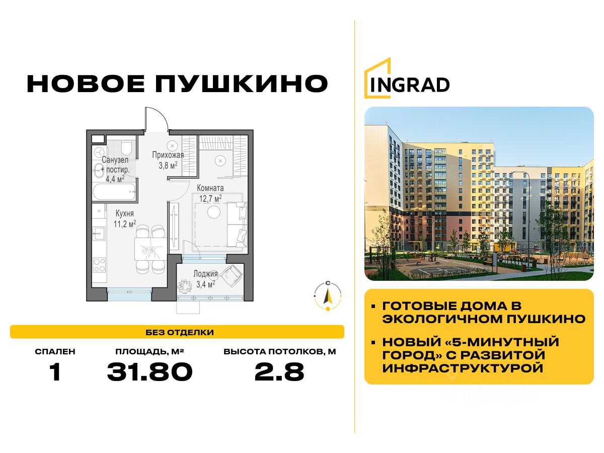Прямая продажа от деволопера. В жилом квартале комфорт-класса "Новое Пушкино" (девелопер Ingrad) продаётся 1-спальная квартира площадью 31.80 кв.м без отделки. Квартира расположена на 9 этаже 14-этажного дома, корпус 23.