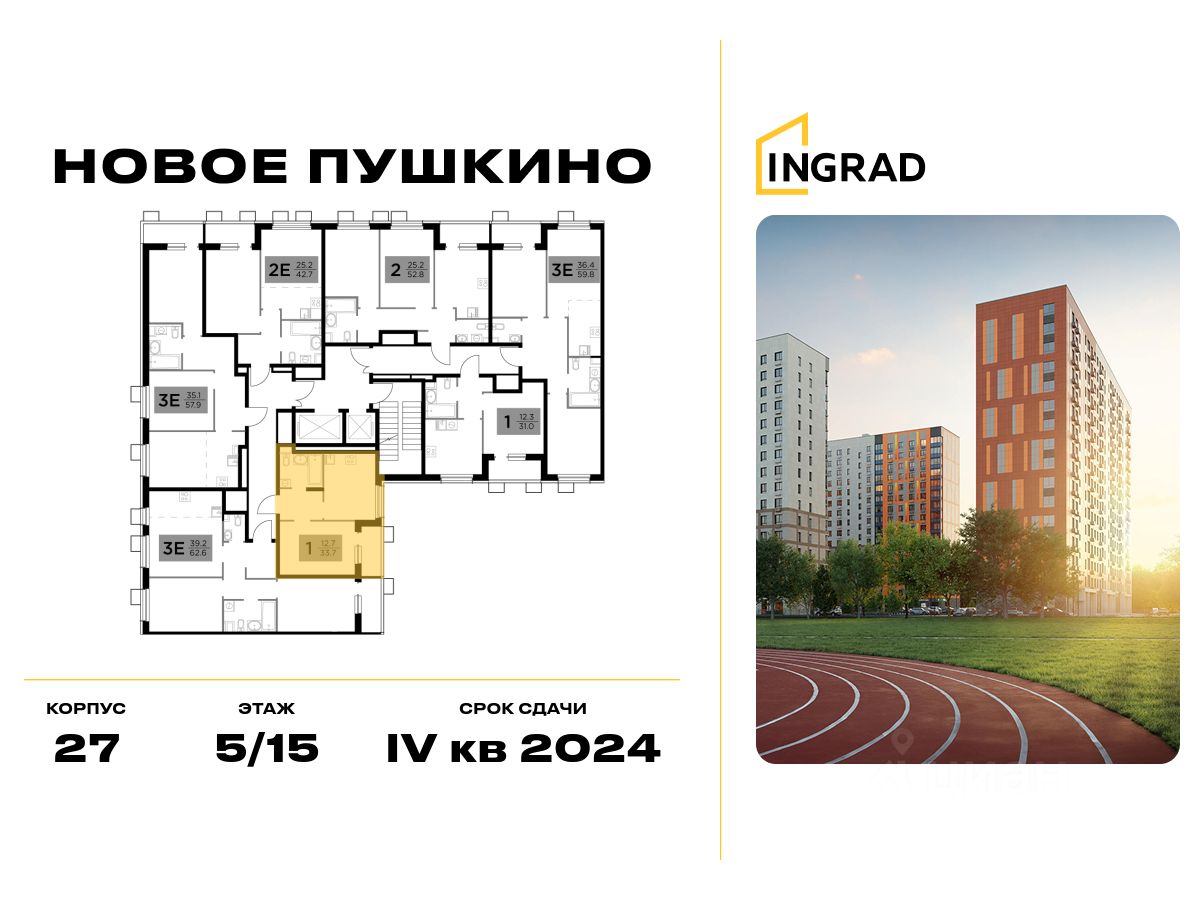 Прямая продажа от деволопера. В жилом квартале комфорт-класса "Новое Пушкино" (девелопер Ingrad) продаётся 1-спальная квартира площадью 32.20 кв.м без отделки. Квартира расположена на 7 этаже 15-этажного дома, корпус 27.