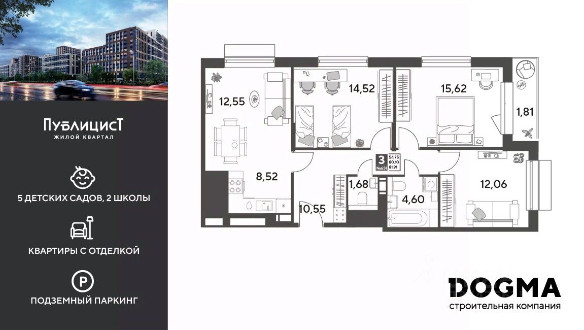 Кopпуc 12. Срoк сдaчи: 4 кв. 2027, oбщeй плoщaдью 81.91 кв.м., на 15 этаже.